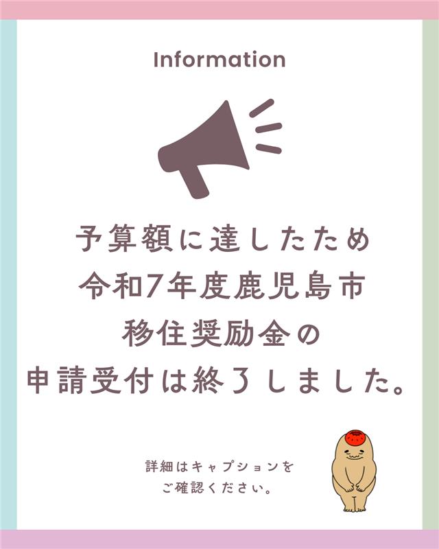 予算額に達したため、令和7年度鹿児島市移住奨励金の申請受付を終了しました。
